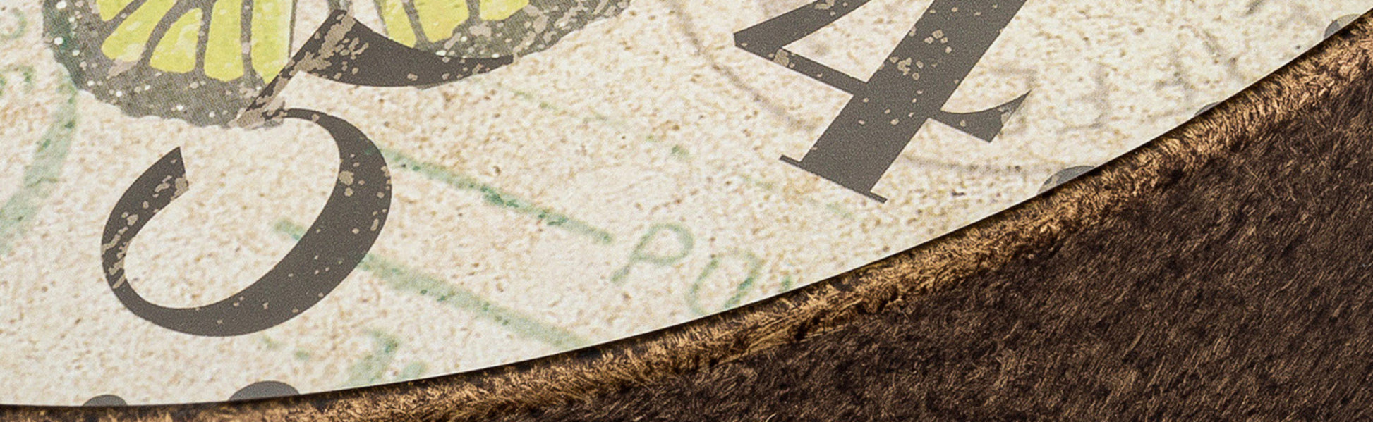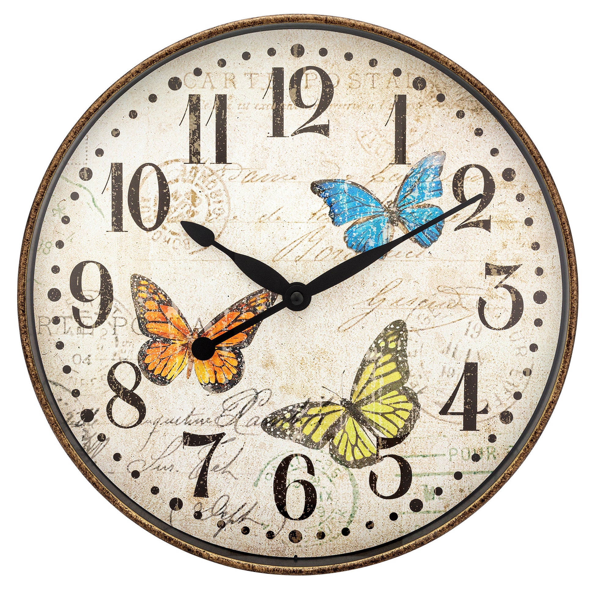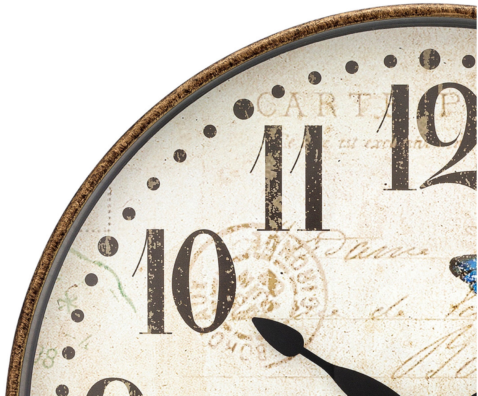This 12" butterfly wall clock showcases a delightful postcard-inspired aesthetic, adorned with vibrant butterfly illustrations that evoke a sense of timeless elegance. This charming vintage design wall clock features an intricate design, making it a versatile addition to any room, seamlessly blending into both classic and contemporary decor styles. The rubbed case finish further enhances its vintage charm, creating a soft, distressed look that's stylish and full of character.