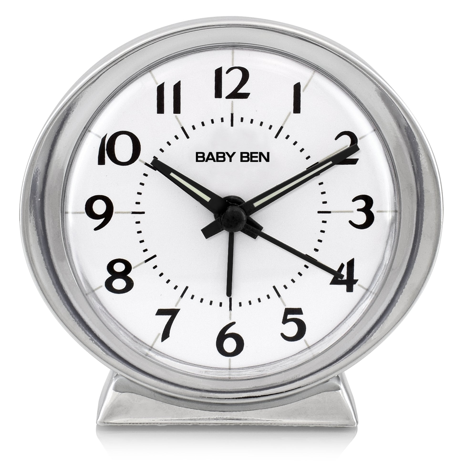 For nighttime convenience, the black hour and minute hands have luminescent centers that emit a soft glow in low light, making this nightstand alarm clock with glowing hands perfect for easily checking the time without turning on a light.
