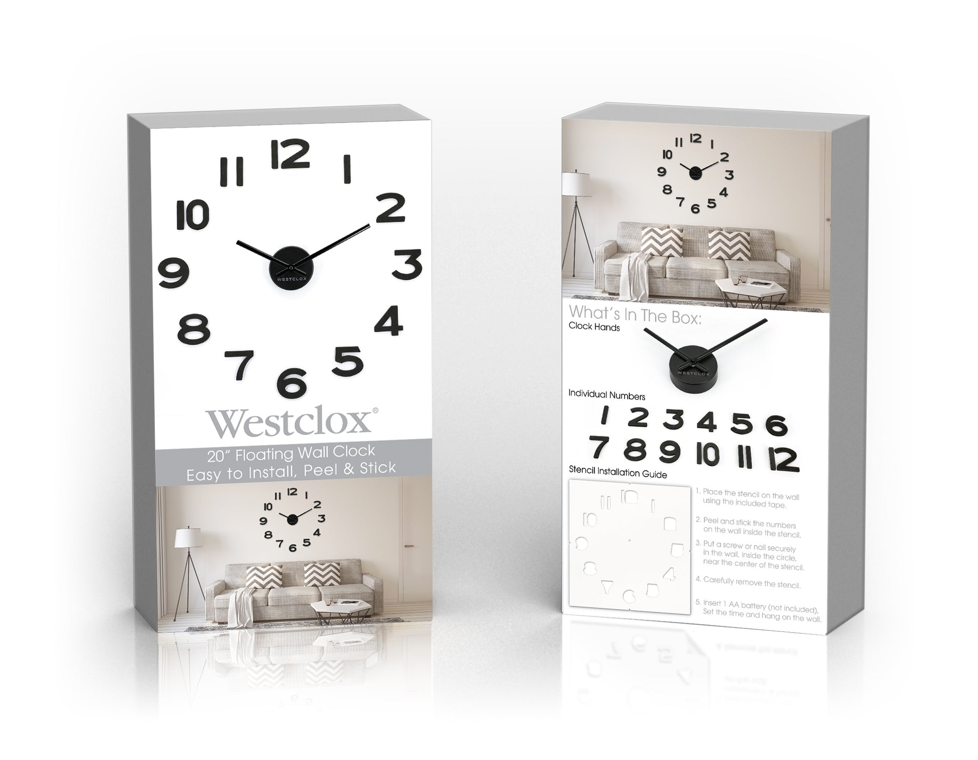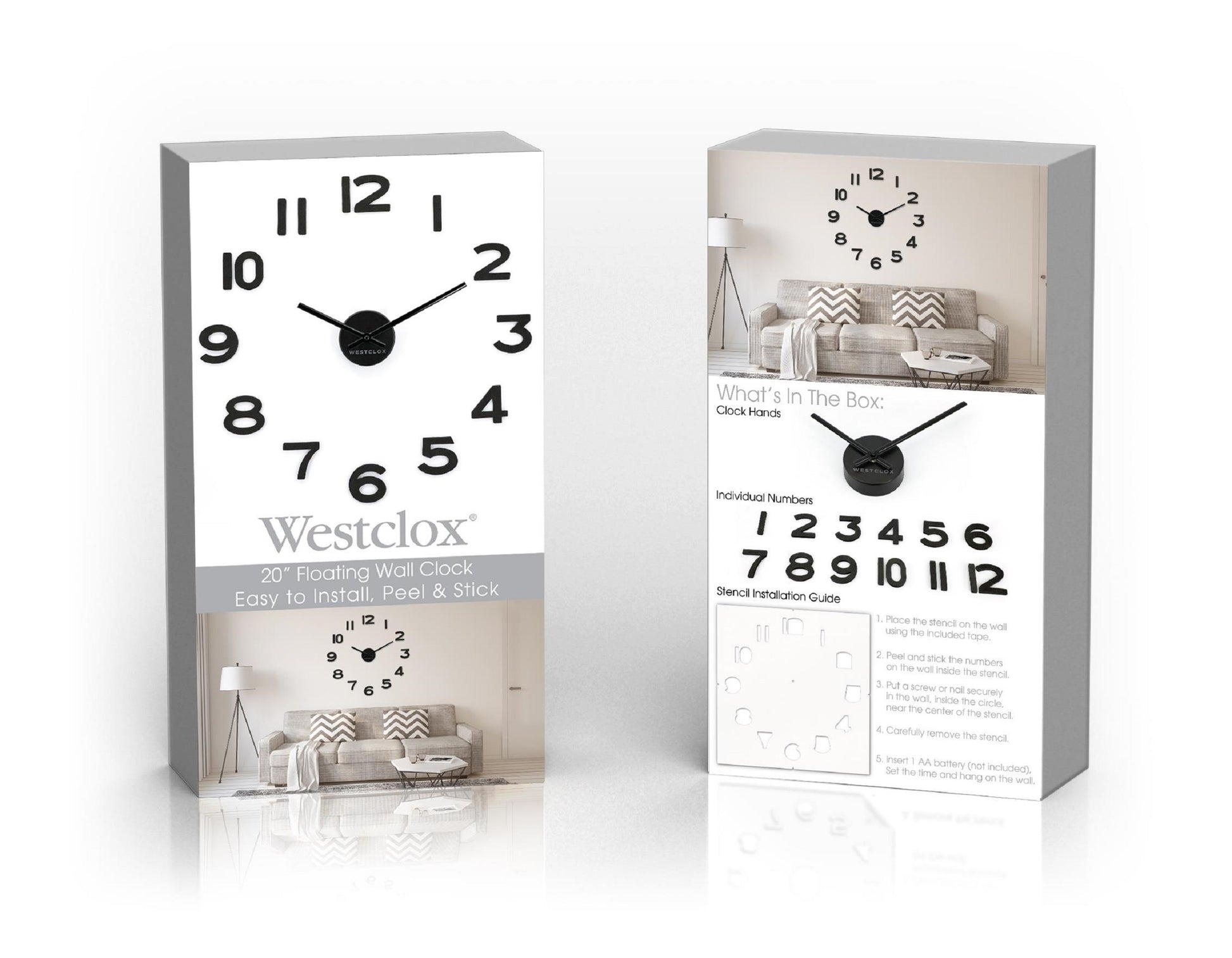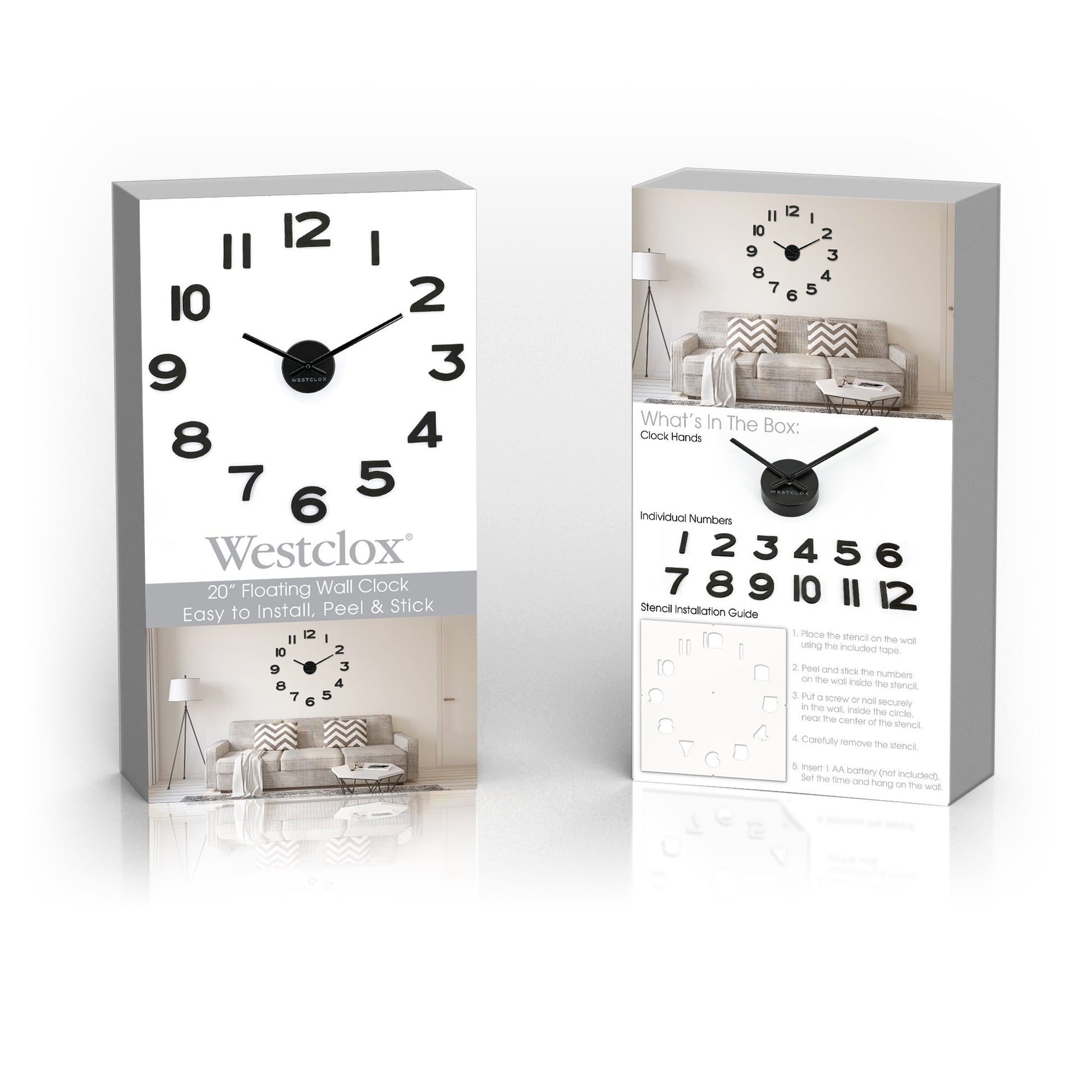 The package includes a convenient installation stencil, ensuring effortless setup and perfect alignment every time. This easy-to-install wall clock runs on standard batteries (not included), making it both wireless and hassle-free.