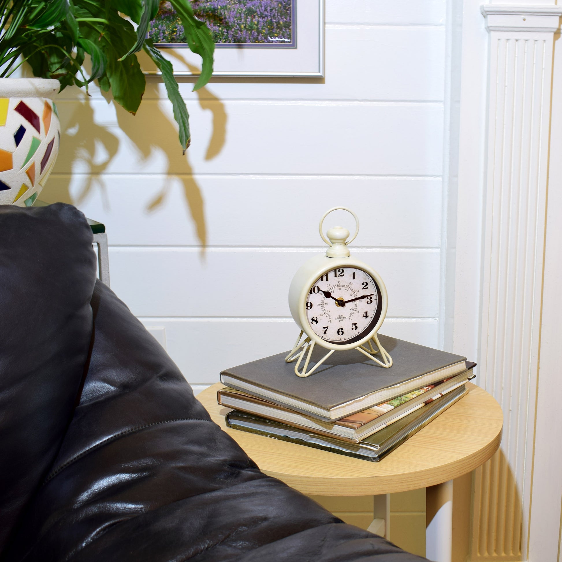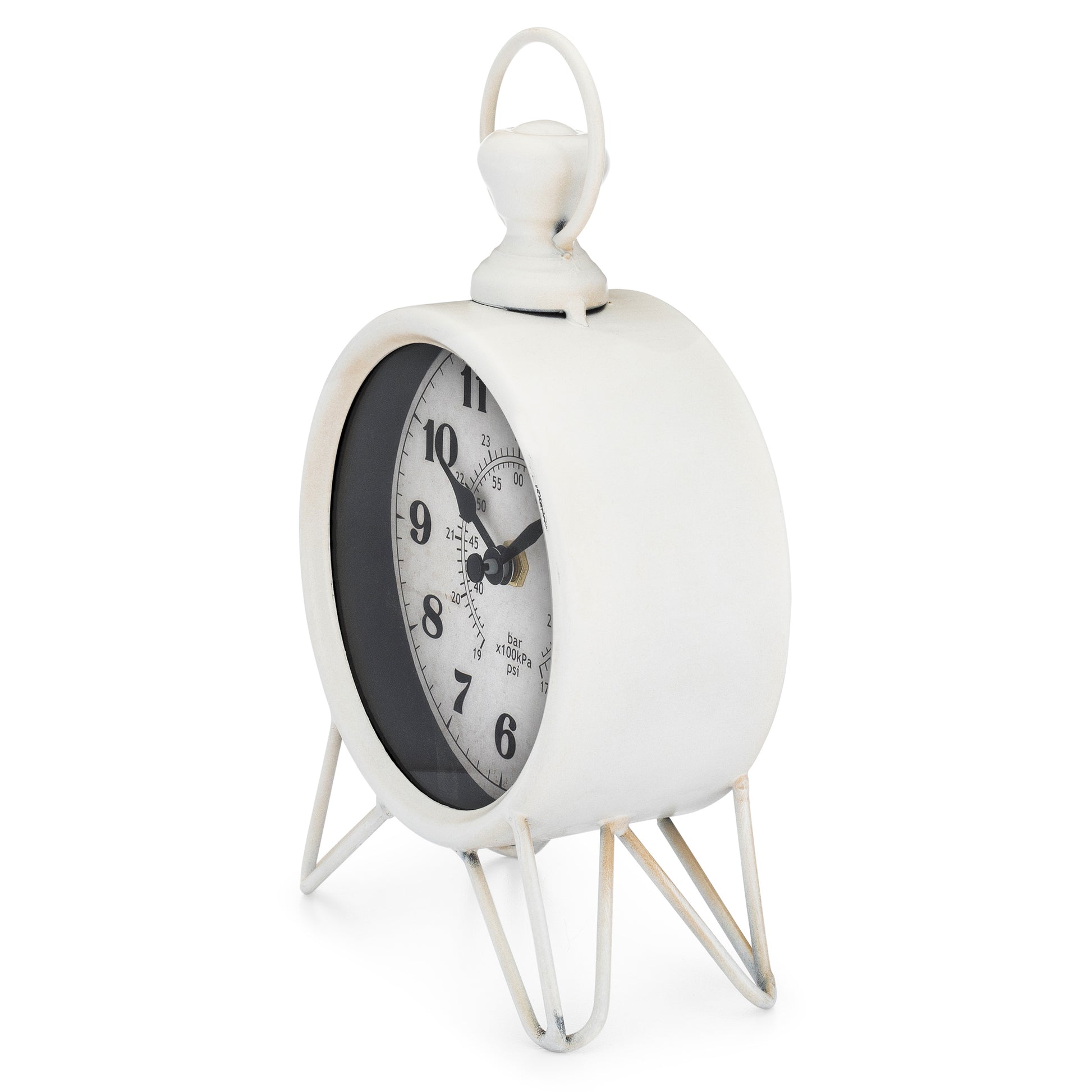 The clock’s sturdy metal construction features gracefully arched feet for stability and a polished knob on top, reminiscent of a captain’s wheel or compass. These design elements not only enhance the visual appeal of this nautical decor table clock but also pay homage to traditional nautical instruments, making it a perfect fit for seaside-inspired or coastal interiors.